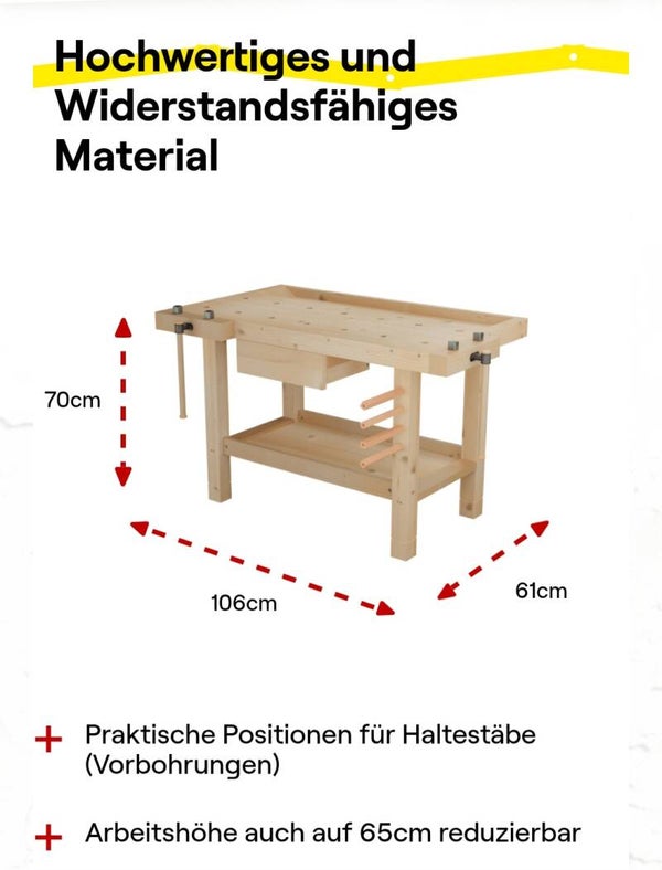 Für optimalen Arbeitskomfort ist die Kinderwerkbank flexibel in der Höhe verstellbar: Mit angeschraubten Füßen erreicht sie eine Arbeitshöhe von 70 cm, und ohne Füße können Sie die Höhe auf 65 cm anpassen.